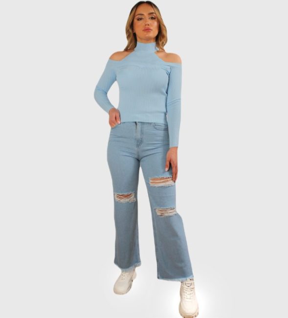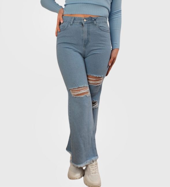 Stylish Ripped High Waist Straight Jeans, Laser Cut, And Trimmed At Bottom.